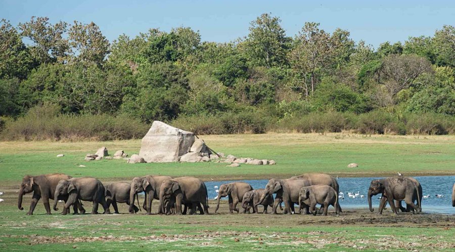 Minneriya National Park, located in the North Central Province of Sri Lanka, attracts a large number of visitors as wild elephants gather in the grasslands. Elephants have become a significant part of the park as there are over 700 wild elephants that dwell within the premises. The elephants thrive on the Minneriya Tank; the water sustains the forest and is the main source of survival for all the other animals. The park is an important habitat for the two endemic monkeys of Sri Lanka. purple-faced langur and toque macaque. Large herbivorous mammals such as Sri Lankan sambar deer and Sri Lankan axis deer frequent the park. Rare and endangered species such as Sri Lankan leopard and Sri Lankan sloth bear inhabit in Minneriya. Minneriya is one of the areas where the gray slender loris is reportedly found in Sri Lanka. Minneriya National Park has recorded over 170 species of birds. From Migrating waders like Woodsand Piper, Common Sandpiper & Kentish Plovers to forest birds like Malabar-pied Hornbills, Rufus Woodpecker the globally endangered Lesser Adjutant and the endemics Sri Lanka Grey Horn-bill, Sri Lanka Green Pigeon, Brown-capped Babbler and Sri Lanka Jungle Fowl are some of the highlights.